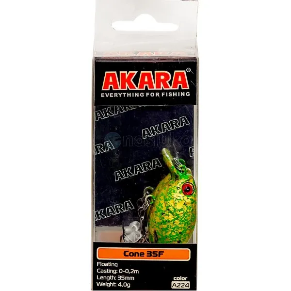 Воблер Akara Cone 35F 35 мм, 4 г - цвят A224 е плитко газещ воблер с изключително стабилна игра, създаден за риболов на пъстърва и кефал.