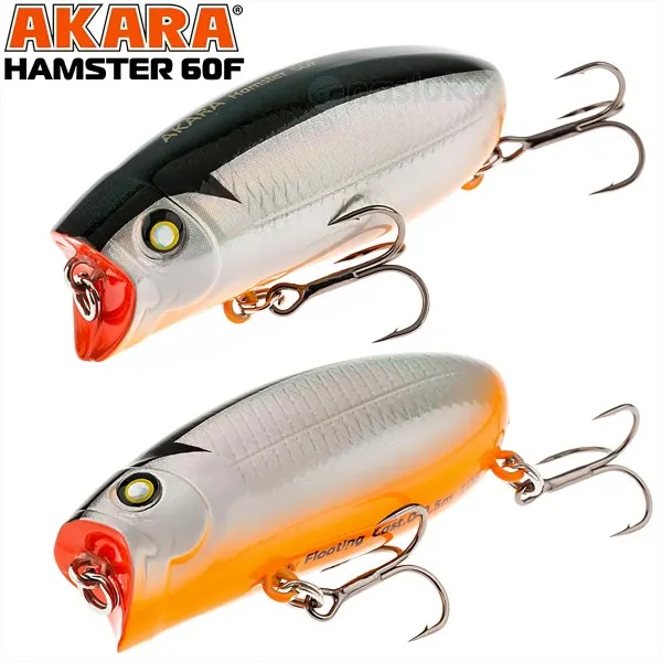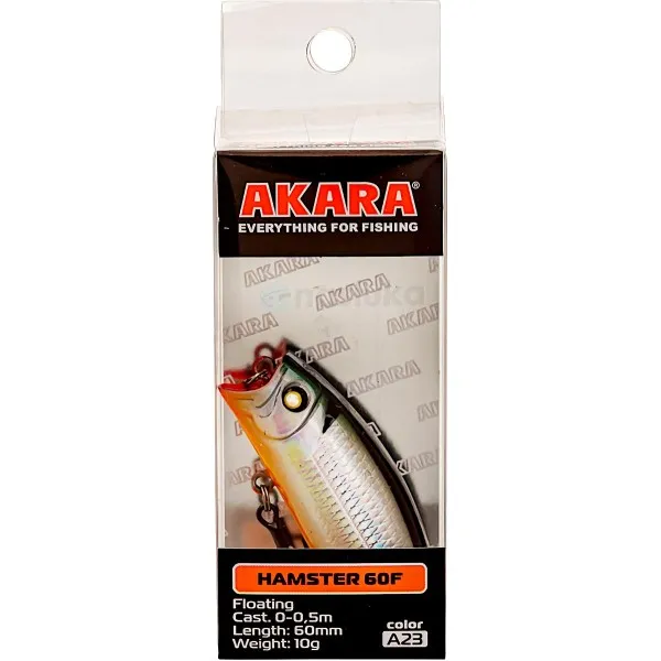 Воблер-Попер Akara Hamster 60F 60 мм, 10 г - цвят A23 е универсална примамка, съчетаваща стиловете попър и уокър, идеална за риболов на щука и костур в плитки зони.