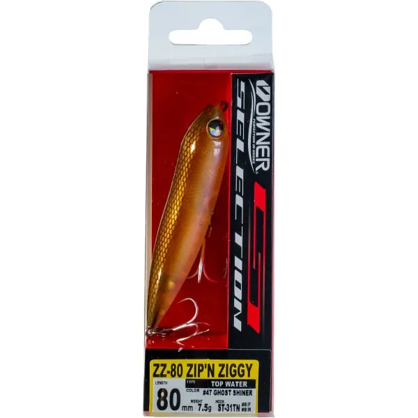 Owner Zip N Ziggy 80mm е класически повърхностен воблер уолкър, създаден за активна игра по повърхността. Имитира паникьосана дребна рибка и провокира агресивни атаки от хищници като щука, костур, распер и сом. 🎣