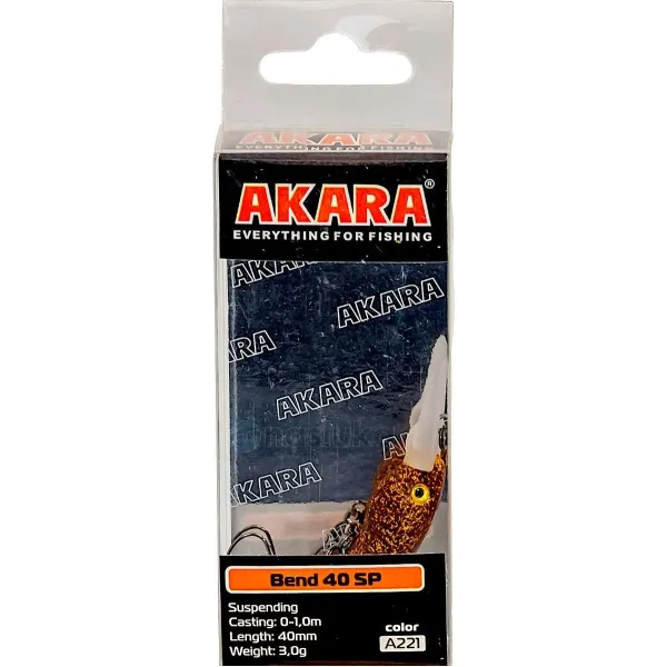 Воблер Akara Bend 40SP 40 мм, 3 г - цвят A221 е неутрална (suspending) примамка, създадена специално за риболов на пъстърва и кефал в течащи или спокойни води.