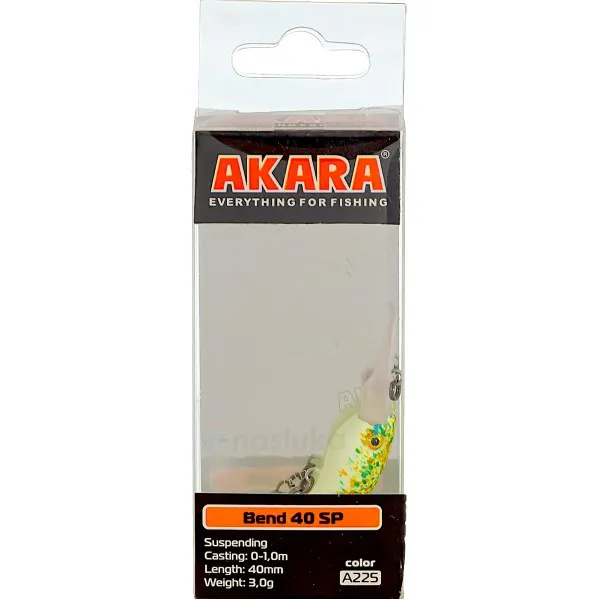 Воблер Akara Bend 40SP 40 мм, 3 г - цвят A225 е неутрална (Suspending) примамка, разработена за пъстърва и кефал. Работи стабилно в плитки зони и не губи баланс дори при течение.