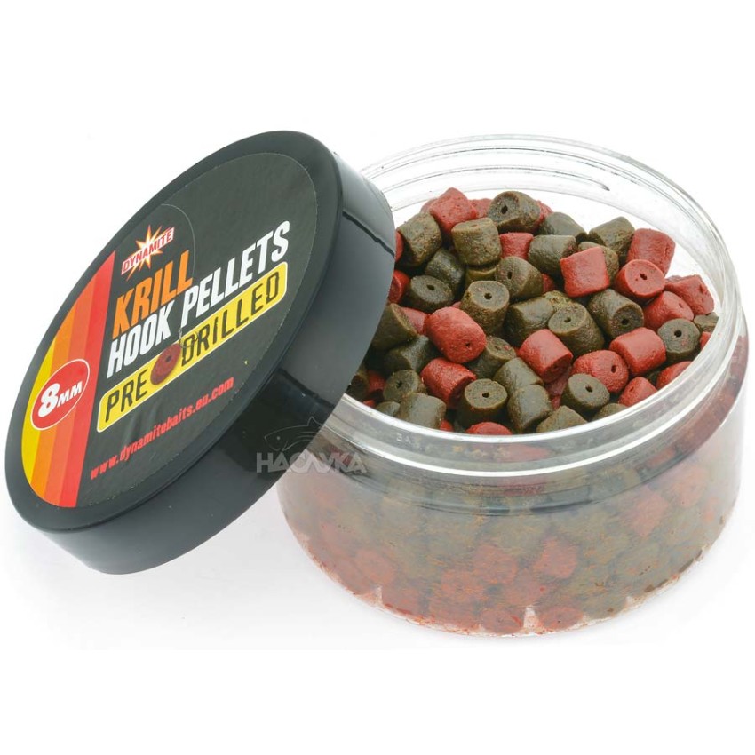 Както всички продукти на марката, така и разпробитите пелети Dynamite Baits Hook Pellets Pre-Drilled притежават познатото високо качество и ефективност. Пелетите са с диаметър 8 мм, което позволява използването им както за фидер риболов, така и при лек шаранджийски риболов. Във всяка опаковка са миксирани два цвята - червени и черни пелети. Отличават се с високо съдържание на протеини и мазнини, което, заедно с оптималния подбор на предлаганите аромати, е в основата на тяхната атрактивност. Пелетите са разпробити, като по този начин лесно и бързо могат да се използват за различни типове монтажи - на косъм или с помощта на силиконов ринг. Подходяща стръв за риболов на шаран, каракуда, едра платика и др.