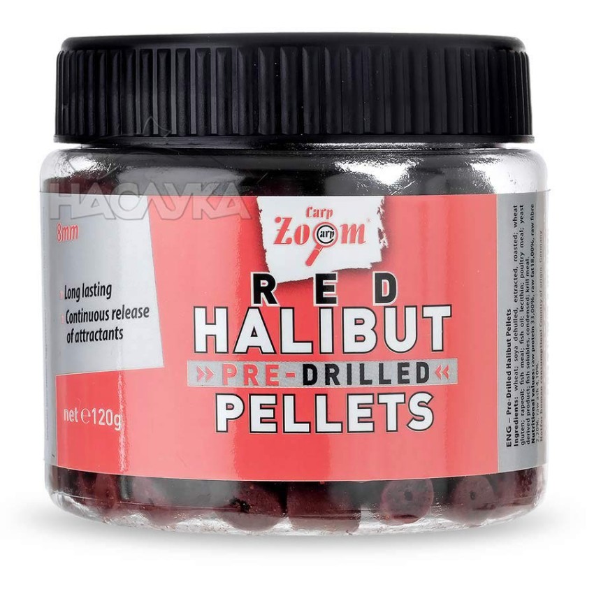 Перфектни червени пелети за стръв с отлични характеристики и дълготраен аромат на черна камбала и рибно брашно. Балансираното съотношение между съдържанието на протеини и мазнини осигурява високо ниво на хранителна стойност. Уникалният аромат и вкус перфектно привлича всички шаранови риби. Разпадат се бавно във водата и работят добре в комбинация с друг вид стръв или самостоятелно. Carp Zoom Red Halibut са предварително разпробити с централен отвор за удобно монтиране и правилно презентиране на стръвта. Осигуряват дълготраен и неустоим ароматен облак около стръвта.