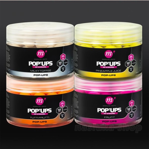 Атрактивни и много резултатни плуващи топчета Mainline Hi-Visual Pop-ups, които се предлагат в различни цветове и аромати.