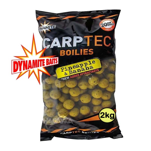 Dynamite CarpTec Pineapple & Banana са изключително качествени протеинови топчета, базирани на птичи храни, бисквитено, рибно брашно и доказано висококачествени ароматизатори, атрактанти и стимулатори. Те са създадени, използвайки най-новата технология за производство и са предназначени да предлагат високо качество на достъпна цена. Dynamite Baits CarpTec са с плътна структура, наситен аромат, приятен цвят и подобрен диапазон на вкуса. Те започват да отдават вкус и аромат, веднага щом попадна във водата. Перфектни за всички метеорологични условия, студена вода, топла вода, реки, езера и платени водоеми.