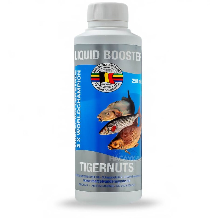 Van Den Eynde Liquid Booster - Tigernuts е течен атрактор с аромат Тигров фъстък, предназначен за добавяне към захранки, теста и миксове. Добавката е много наситена, с плътна консистенция, създадена на базата на висококачествени съставки. Повишава ефективността на захранката или микса, благодарение на силния вкус и аромат. Освен, че овкусява и ароматизира, допълнително подобрява слепването на частиците на захранката, така че се получава подходяща смес, която може да се задържи добре при поставяне на фидер хранилка. Добавката може да се използва за заливане на пелети или протеинови топчета.
