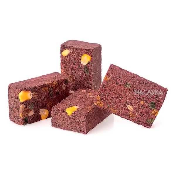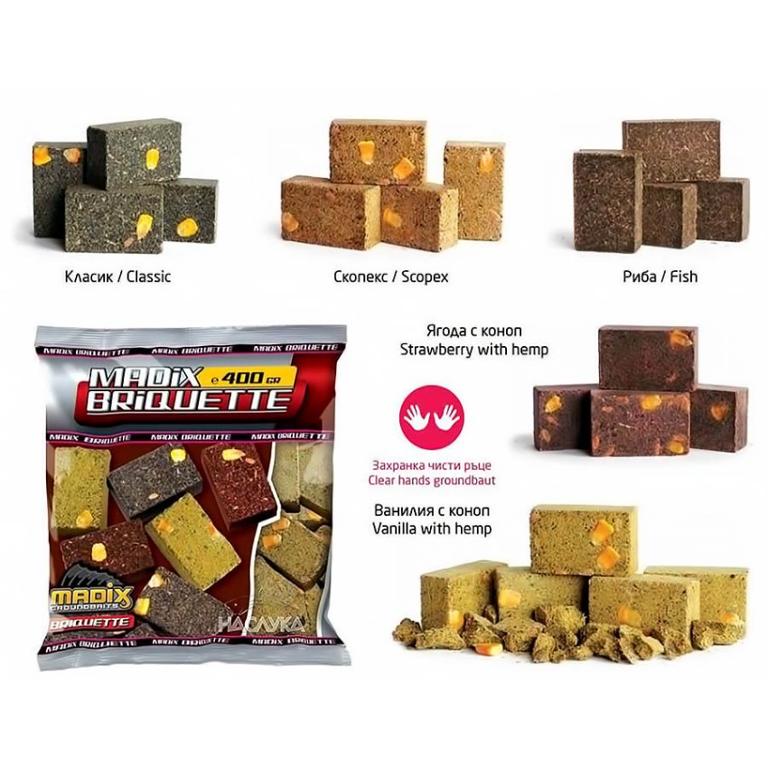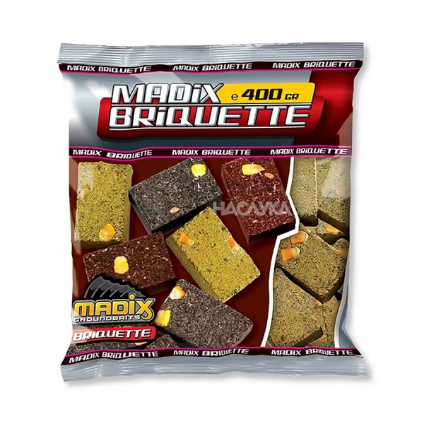 Високопротеинова брикетирана захранка за риболов от Madix. Пресована на стегнати кубчета, тя се разпада бавно във водата и образува ароматен облак.